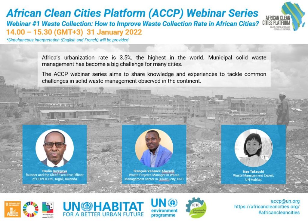The first webinar addressed the issue of waste collection – many cities in Africa struggles to achieve high waste collection rate. UN-Habitat studies on Waste Wise Cities Tool so far have found that waste collection rate in Sub-Saharan African cities ranges from 7% to 60%, observing huge amount of uncollected waste becomes a public health concern. The first webinar invited founder of Mr. Paulin Buregeya, Chief Executive Officer of COPED Ltd (Compagnie pour l’Environnement et Développement au Rwanda), to speak Kigali’s experience to improve waste collection rate to more than 80%. The another speaker is from Bukavu City DRC Mr. Francis Sawanga, the ACCP focal person from the city. Bukavu City applied Waste Wise Cities Tool in 2021 and the survey results showed 7% of waste collection rate. The session explored how African cities can improve the waste collection coverage, through presentations and dialogue between prominent speakers.